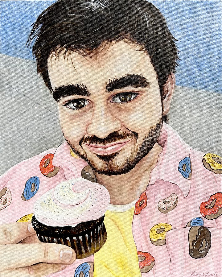 A commissioned painting of love, including his warm eyes, a favorite shirt, and tiny glass beads as textural sugar to top the cupcake! 24x18x1.5 | acrylic on canvas